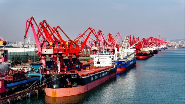 在山东港口日照港煤炭泊位,货轮停泊卸煤(2024年12月4日摄,无人机照片)。新华社记者 郭绪雷 摄