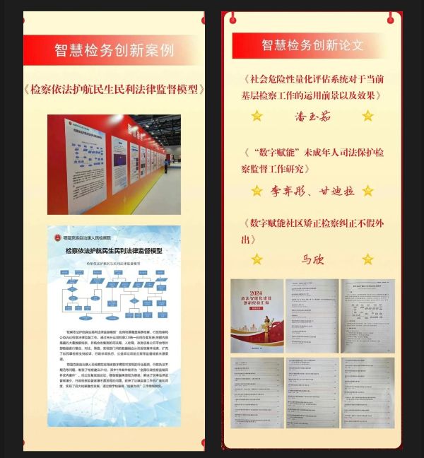 注重监督成果转化,数字赋能提档升级。细化监督协作方式方法,实现共赢,“深化检察监督依法护航民生民利模型”应用中,与旗人社局共同建立了《劳动保障监察执法与民事检察衔接机制工作办法》,进一步完善了劳动保障监察执法与民事检察工作衔接机制,延伸数字模型效应。该监督模型入选2024政法智能化建设“智慧检务”创新案例。“刑事执行检察社区矫正对象违规外出检察监督模型”应用中,与旗公安局、司法局联合会签了《关于加强社区矫正大数据应用衔接配合工作机制》,明确依托各自现有的信息化平台,整合社矫对象数字信息资源,细化并规范信息共享模式,共同形成监督合力。《社会危险性量化评估系统对于当前基层检察工作的运用前景以及效果》等三篇论文入选2024政法智能化建设“智慧检务”创新论文。