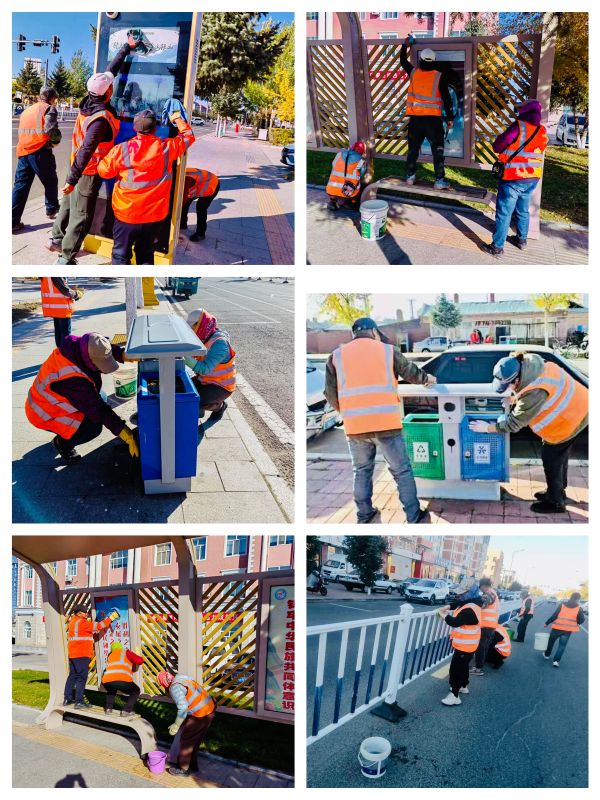 公共设施是一个城市文明的象征,为持续提升干净、整洁的市容环境,提高全旗城镇环境卫生、净化公共设施,进一步推进我旗创建全国文明城市工作,10月13日,市政园林环卫事业服务中心组织清扫保洁组职工采用人工擦拭的方式,对巴彦托海镇及河西新区中央街、主次干道等重点区域隔离栏、果皮箱、公交站牌等公共设施进行擦拭、清洗,确保公共设施“见本色,显颜色”。
