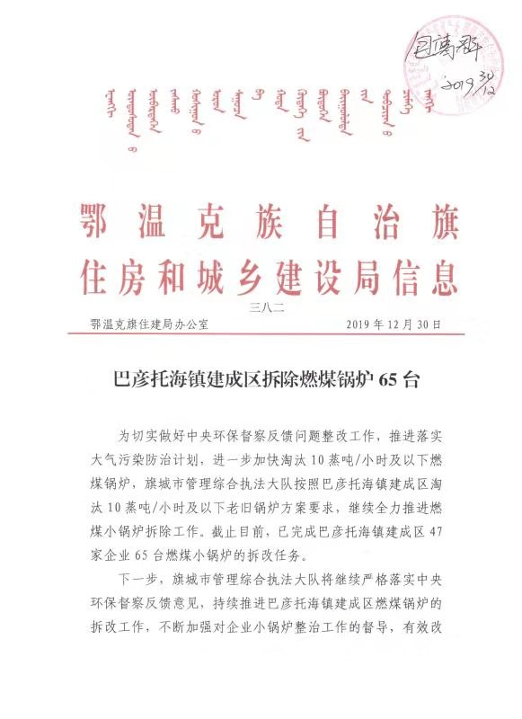 1.对于脱贫攻坚、污染防治方面,我局积极开展危房改造及建成区燃煤小锅炉治理工作。截止目前,2019年脱贫攻坚危房改造为8户,已完成巴彦托海镇建成区47家企业65台燃煤小锅炉的拆改任务。
