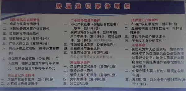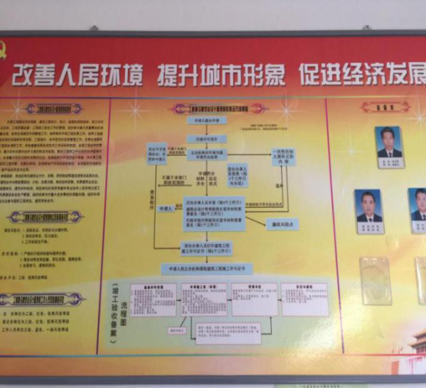 我局将施工许可证、房屋登记要件明细等事项的办理流程图及要求制作成图版上墙,全面规范各项工作流程,方便群众办理各类业务的同时强化群众监督,进一步提高了我局依法行政、依法办事的水平。