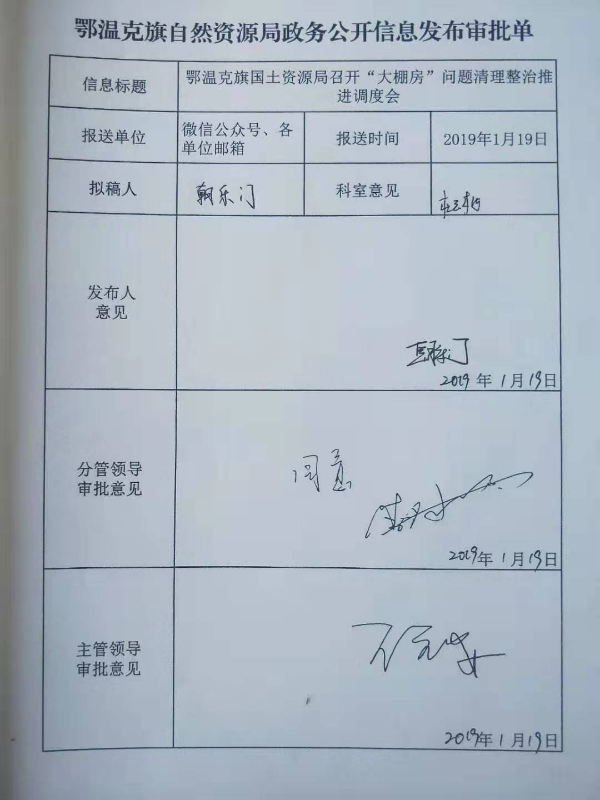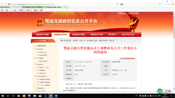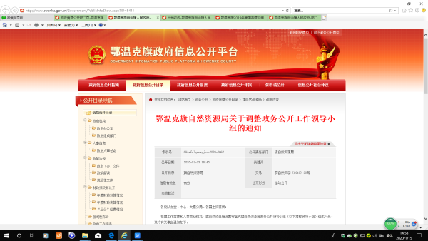 2、健全政务公开领导机制,将政务公开工作列入领导分工。2019年6月份,制定了《鄂温克旗自然资源局关于调整政务公开工作领导小组的通知》(鄂自然资字〔2019〕39号),并在旗政府门户网站公开发布。