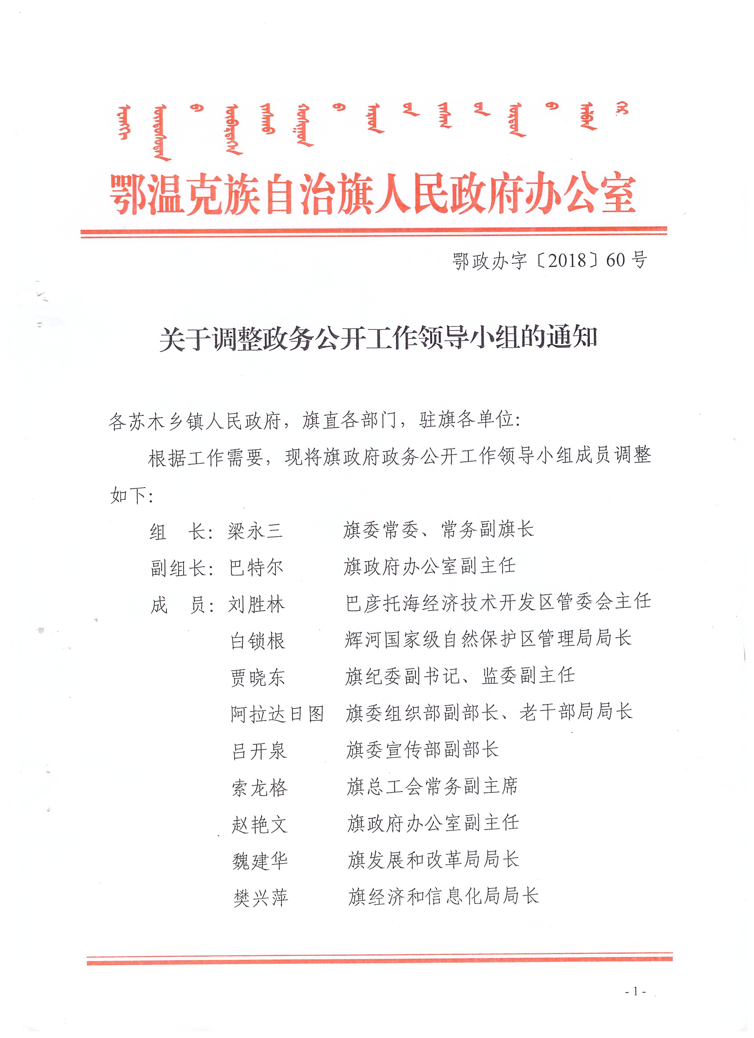 2018年6月份,我旗调整了政务公开工作领导小组,成立了以旗委常委、常务副旗长梁永三同志为组长,政府办公室副主任巴特尔同志为副组长,相关单位负责人为成员的政务公开工作领导小组,明确指定旗政府信息调研室具体负责全旗政务公开工作,落实政务公开的各项要求,做好牵头协调和监督检查。并配备了专职工作人员一名,负责日常工作。