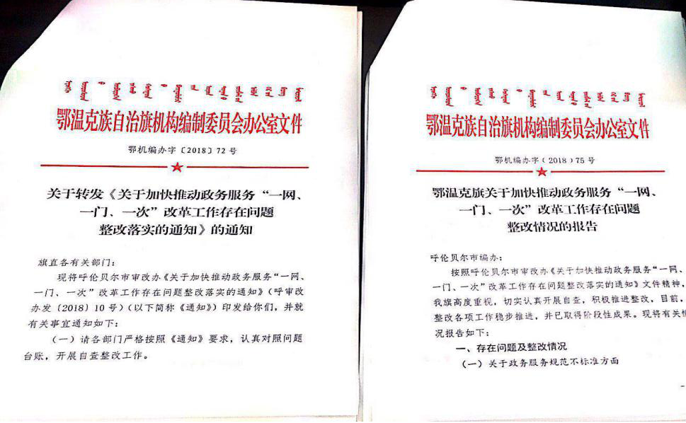 为努力实现企业和群众办事“只进一扇门”和“最多跑一次”,按照呼伦贝尔市审改办《关于加快推动政务服务“一网、一门、一次”改革工作存在问题整改落实的通知》精神,我旗高度重视,切实认真落实,针对存在的“政务服务规范不标准;证明材料重复提供、过多过滥;便民利企不到位、不方便;服务大厅规划不统一、事项不集中、办事来回跑;便民服务设施不完善、政务服务不畅通、中介服务不规范”等问题积极整改,进一步强化问题导向,增强整改意识,抓住具体问题,持续推进整改,确保高标准、高质量全面完成整改任务。对已完成的整改任务,适时组织“回头看”,不断深入和巩同整改成果。在抓好整改的同时,更加注重治本,更加注重预防,建立健全相关工作机制,构建整改工作的长效机制。