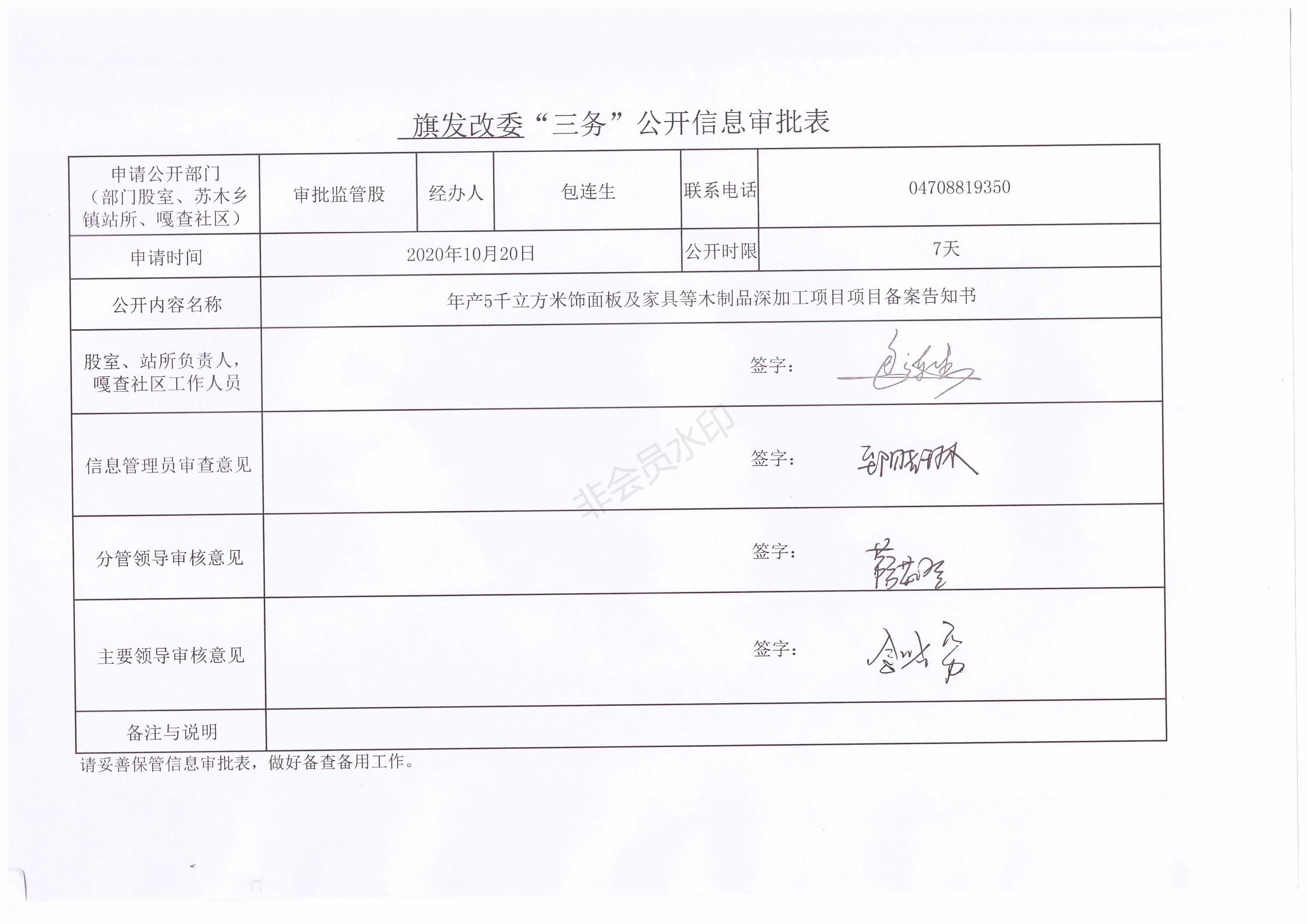 经核查,你单位申请备案的 年产5千立方米饰面板及家具等木制品深加工项目 项目,符合产业政策和市场准入标准,准予备案。请据此开展有关工作。在开工建设前,应当办理法律法规要求的其他手续,方可开工。特此告知!