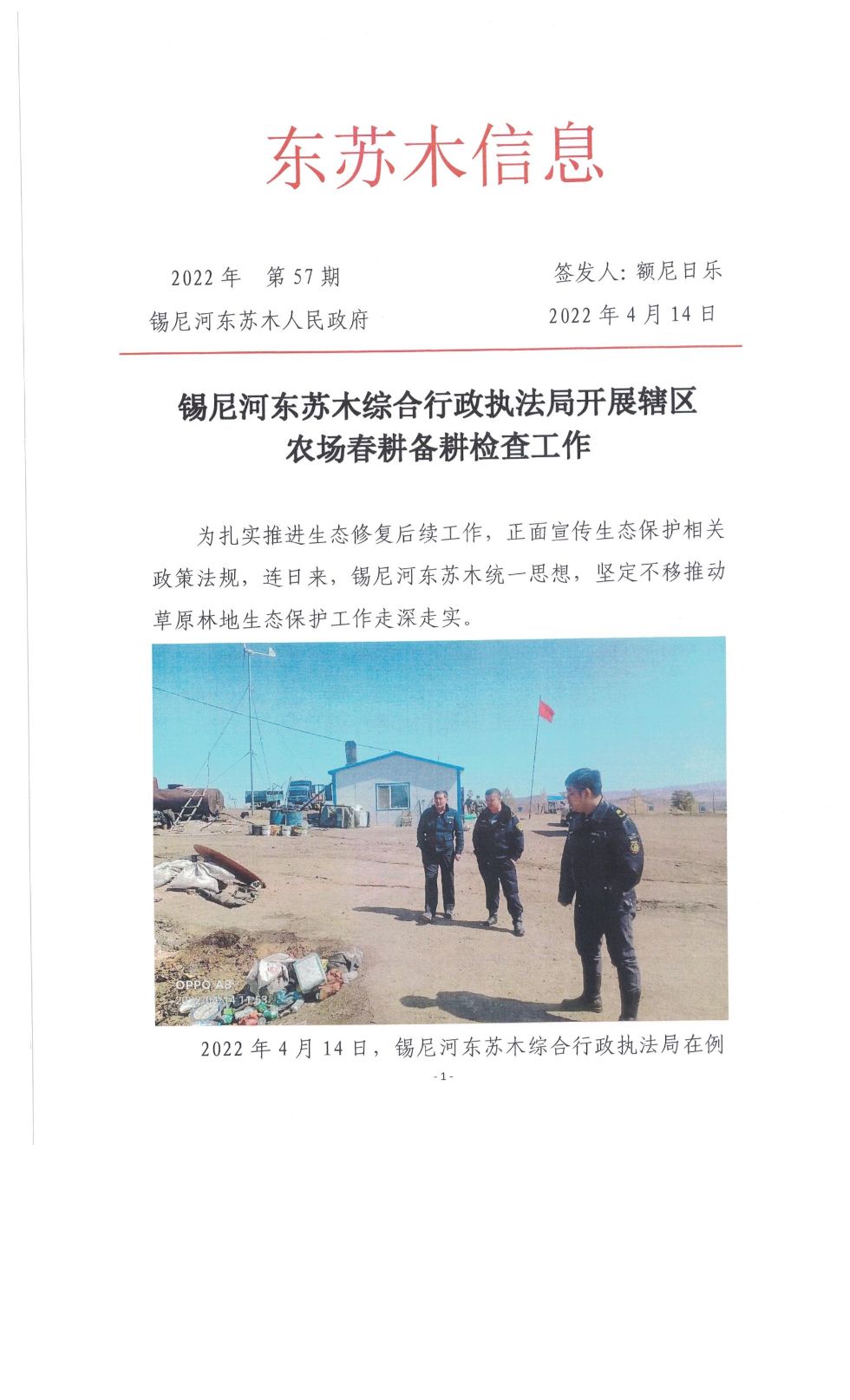锡尼河东苏木综合行政执法局开展辖区农场春耕备耕检查工作