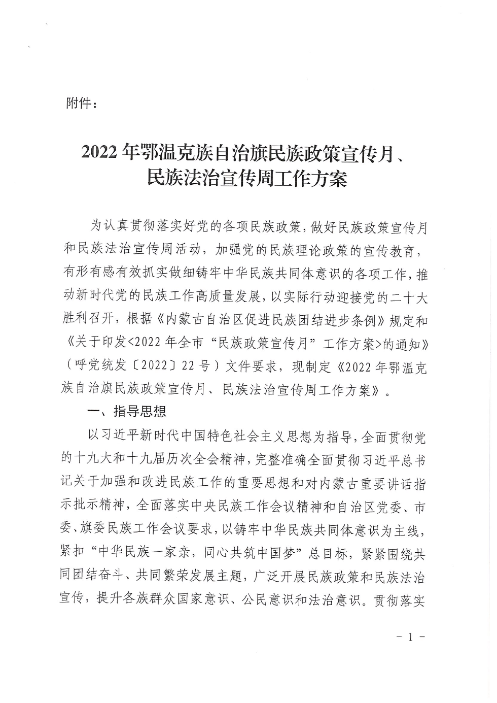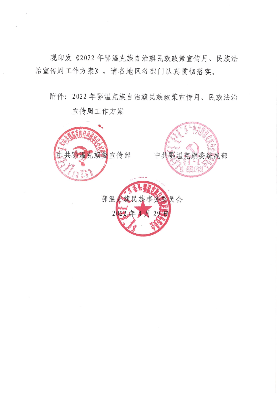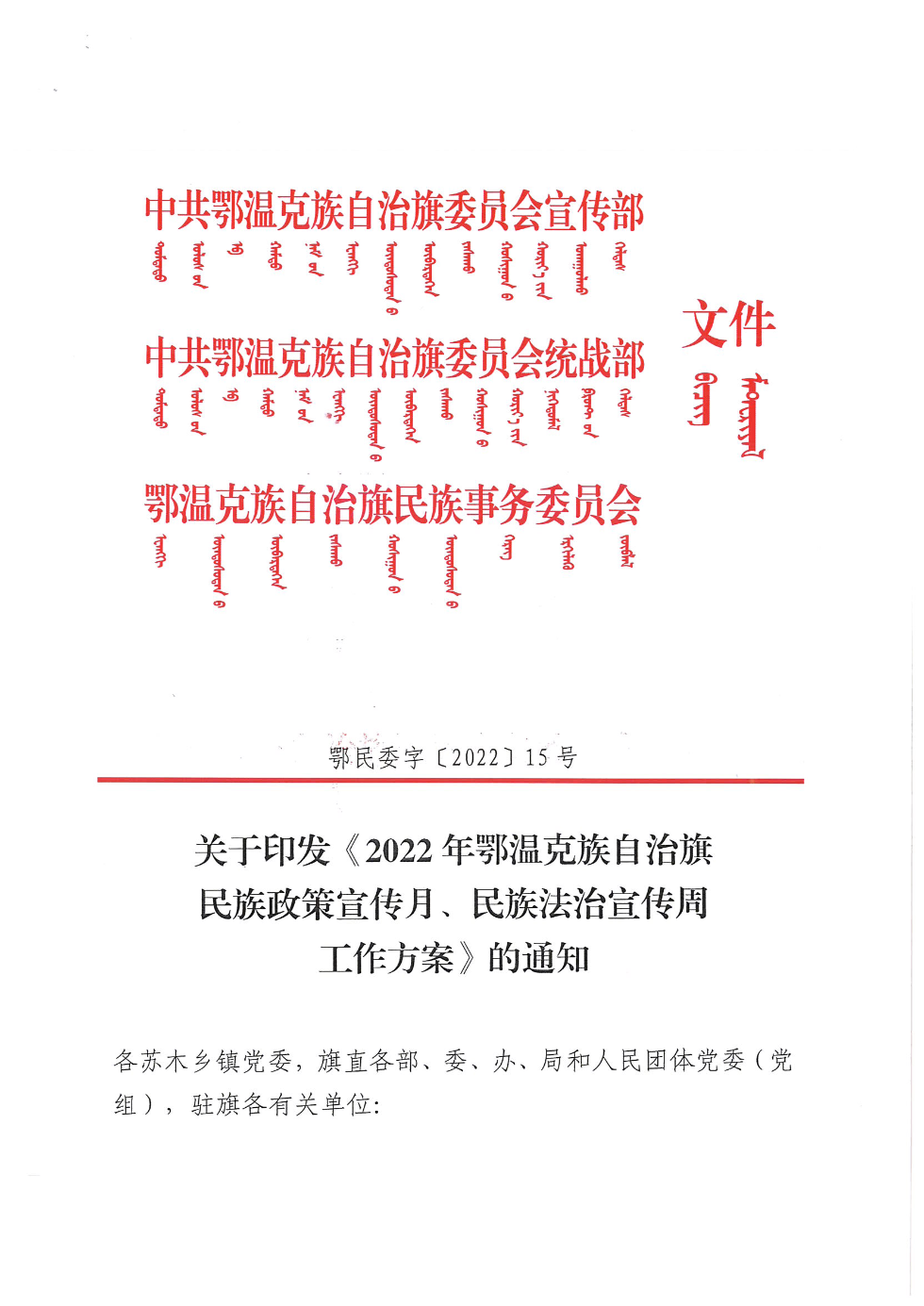 关于印发2022年《鄂温克族自治旗民族政策宣传月、民族法治宣传周工作方案》的通知
