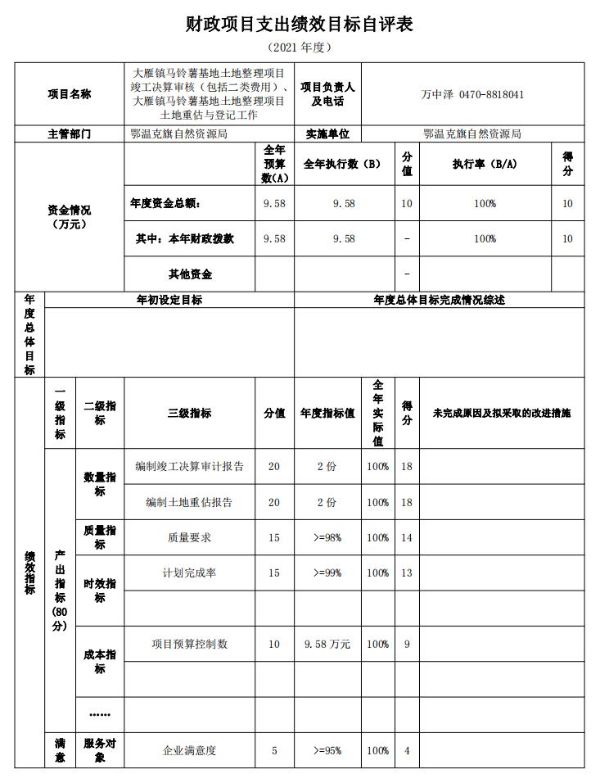 2.大雁马铃薯基地土地整理项目决算审核项目自评综述:根据年初设定的