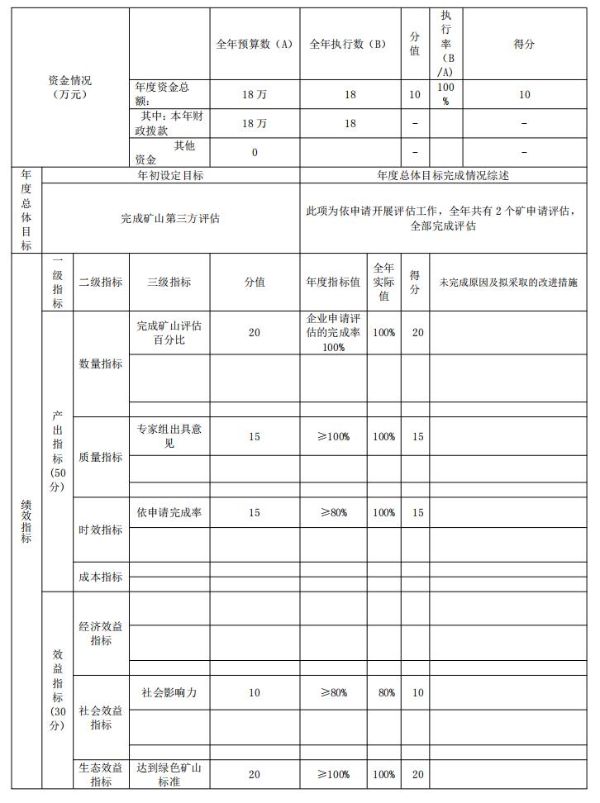 目绩效目标完成情况:此项目完成矿山第三评估,全年有 2 个矿申请评估,已