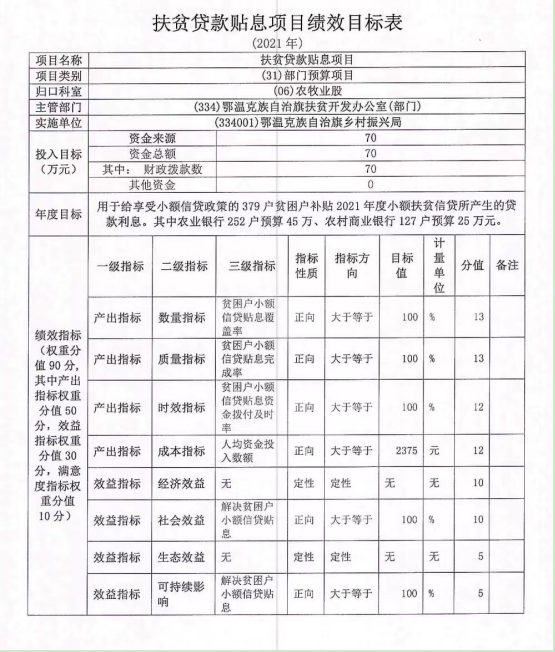 1.2021 年扶贫贷款贴息项目自评综述:根据年初设定的绩效目标,项目自评得分 98.84 分。全年预算数为 70万元,执行数为 61.86 万元,完成预算的 88.37%。项目绩效目标完成情况:完成小额信贷贴息383户61.86万元。其中,农业银行243 户 31.99 万元;农村商业银行140户29.87万元。发现的主要问题及原因:预算结余8.14 万元;银行上报贴息计划及额度不及时影响资金文出进度。下一步改进措施:加快贷款户贴息材料审核,合理安排资金文出进度,提高资金使用效率。