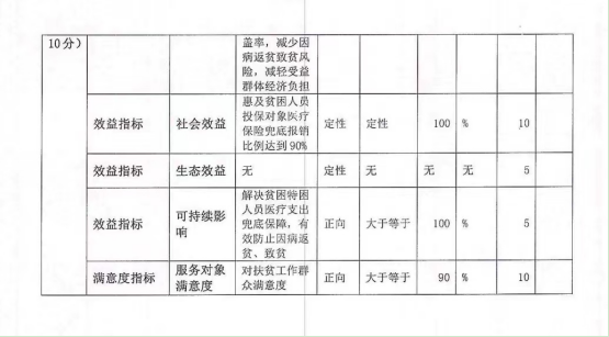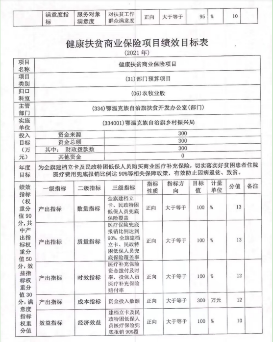 2.2021年健康扶贫商业保险项目自评综述:根据年初设定的绩效目标,项目自评得分 99.71分。全年预算数为 300万元,执行数为 297.59万元,完成预算的 99.2%。项目绩效目标完成情况:为全旗建档立卡及民政特困低保人员9624 人购买商业医疗补充保险 297.59万元,切实落实好贫困患者住院医疗费用兜底报销比例达90%等相关保障政策,有效防止因病返贫、致贫。发现的主要问题及原因:预算结余 2.41万元、与合作金融机构沟通不及时,保费赔付台账建立不完善。下一步改进措施:加强与合作金融保险机构的协作沟通,完善项目档案、台账建设,及时收回保险机构风险调节资金的年度结余部分并上缴财政,使资金使用成效进一步提升。