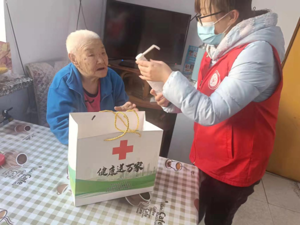 居民可在本社区领取“健康防疫包”。社区工作者为居民讲解使用方法,普及疫情防控知识,并为行动不便老年人入户发放,叮嘱老人和家属加强防护、科学防疫、合理用药。