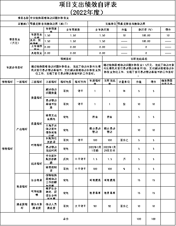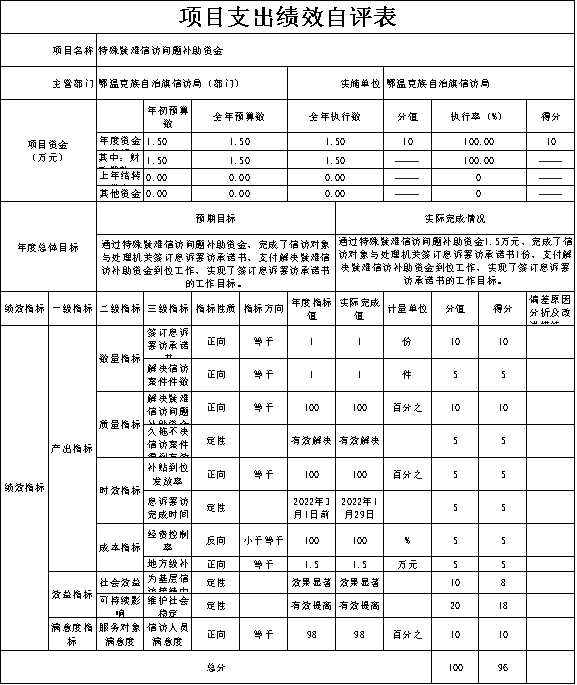 1.2022年特殊疑难信访问题补助资金项目自评综述:根据年初设定的绩效目标,项目自评得分96分。全年预算数为1.5万元,执行数为1.5万元,完成预算的100%。项目绩效目标完成情况:(1)产出指标完成情况分析。2022年1月29日,我单位解决上访案件1件,签订息诉罢访协议书1份。(2)效益指标完成情况分析。项目支出在2022年发挥了时效,项目对环境没有影响因素,在社会效益方面发挥了较好作用,2022年化解信访问题1件,社会环境总体稳定;中央特殊疑难信访问题补助资金支出维持了我旗的总体稳定,为我市经济社会的发展提供良好社会环境。(3)满意度指标完成情况分析。2022年度,上访人员对信访工作满意度92%。发现的主要问题及原因:无。下一步改进措施:无。