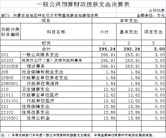 内蒙古自治区呼伦贝尔市鄂温克族自治旗信访局部门2022年度一般公共预算财政拨款支出决算295.24万元。与年初预算288.3万元相比,完成年初预算的102.41%。其中: