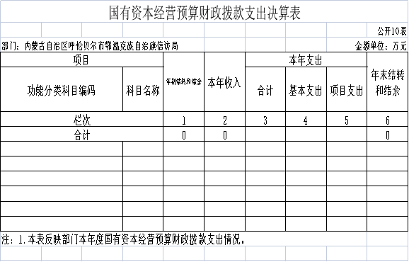 内蒙古自治区呼伦贝尔市鄂温克族自治旗信访局部门2022年度国有资本经营预算支出决算0万元。与上年决算相比,增加(减少)0万元,增长(减少)0%,变动原因:本年无国有资本经营预算财政拨款收、支、余。