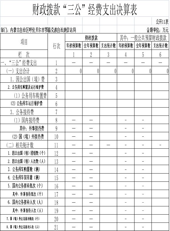 2.从决算单位构成看,纳入本部门2022年部门汇总决算编制范围的预算单位共计1家,具体包括:鄂温克族自治旗信访局部门本级详细情况见表: