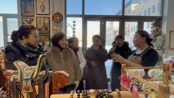 随后,一行人前往鄂温克族自治旗民族文化产业创业园。在这里,大家实地参观了非遗传承人的工作室,亲眼看见了传统技艺的制作过程。太阳花、皮雕、毡艺、哈尼卡等非遗资源记录着历史,见证着人民智慧和劳动成果。从精美的皮雕皮具工艺到细腻的特色旅游纪念品制作,每一道工序都展现了非遗传承人的精湛技艺和对传统文化的执着坚守。代表们与非遗传承人亲切交流,深耕北疆文化内涵,领略非遗技艺之美,感受中华优秀传统文化的魅力。