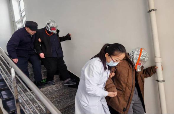 桌面推演结束后,随即开展了实战演练。随着一阵急促的警报声响起,各部门迅速响应,护理人员迅速组织老人戴好消防面罩,低姿弯腰,沿着预定的疏散路线快速、有序地撤离到安全区域。