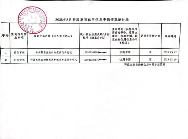 鄂温克族自治旗住房和城乡建设局3月行政事项信用信息查询情况统计表