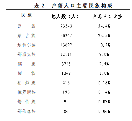 鄂温克族自治旗是个多民族聚居地区,由25个民族构成,少数民族人口61431人,比上年增加447人,占总人口的比例为45.6%,比上年上升0.4个百分点。