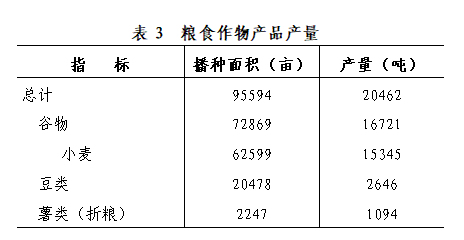 全年粮食产量2.05万吨,增产69.0%。其中:谷物产量1.67万吨,增产65.6%;豆类产量0.26万吨,增产83.2%;薯类产量0.11万吨,增产93.4%。