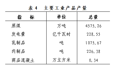 全年原煤产量4575.26万吨,比上年下降5.6%;发电量228.55亿千瓦时,下降9.7%;乳制品产量1075.67吨,下降12.7%;肉制品产量226.38吨,下降41.1%;商品混凝土产量0.34万立方米,下降93.7%。