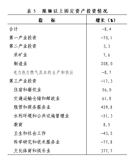 全年限额以上固定资产投资比上年下降8.4%。其中,建设项目投资比上年下降2.8%;扩建项目投资增长391.0%;改建和技术改造项目增长3.8%。