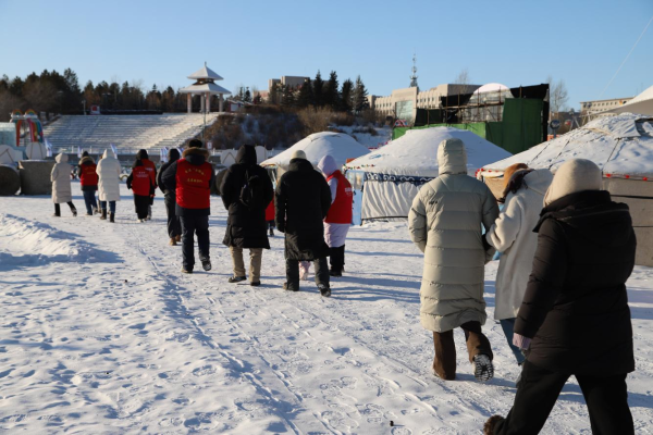 本次活动以“冰雪传情,志愿同行”为核心主题,紧扣民族团结进步与新时代文明实践双重使命,精心设计兼具文化内涵与互动乐趣的特色环节,既为各族群众搭建了交流互动的平台,也让志愿服务成为促进情感交融的重要纽带。活动在朝气蓬勃的职工健步走中拉开帷幕,志愿者们沿着冰雪乐园的专用步道阔步前行。凛冽的寒风中,大家相互鼓劲、并肩前行,整齐的步伐踏响雪地,爽朗的笑声回荡在乐园上空。这场健步走活动,不仅让参与者在运动中锻炼了体魄、释放了压力,更在协作互动中拉近了彼此距离,增强了各族干部群众的集体凝聚力与向心力,展现出团结一心、奋勇争先的精神风貌。