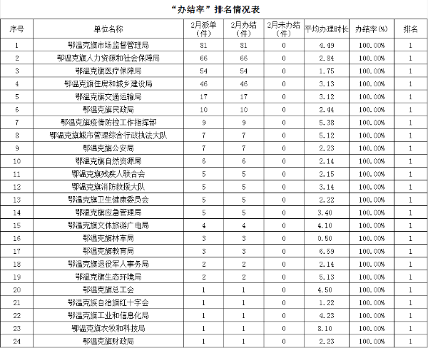 从旗直各部门和单位2月份转办工单的办结情况看,旗市场监督管理局、人力资源和社会保障局、医疗保障局等24个部门和单位办结率均达到100%。