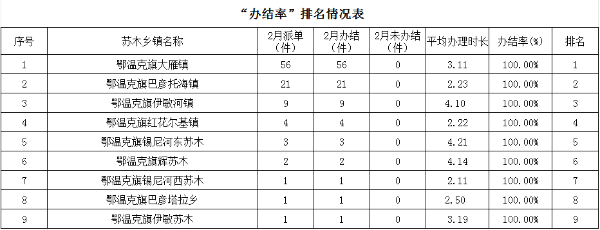 根据各苏木乡镇2月份转办工单办结情况,大雁镇、巴彦托海镇、伊敏河镇、红花尔基镇、锡尼河东苏木、辉苏木、锡尼河西苏木、巴彦塔拉乡、伊敏苏木办结率均达到100%。