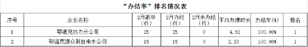 从我旗企业2月份转办工单的办结情况看,热力分公司、众利自来水公司办结率均达到100%。