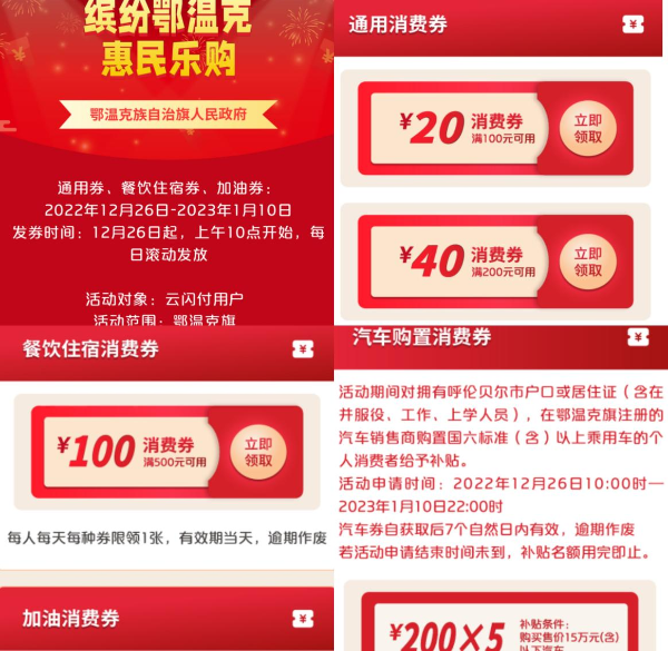 为深入贯彻落实好国家、自治区、呼伦贝尔市关于扩大内需促进消费,稳住经济大盘的决策部署,进一步优化消费供给、提振消费信心、释放被疫情抑制的消费潜力,活跃餐饮、商超、新车销售等消费市场。12月26日—1月10日,鄂温克族自治旗商务局组织开展了“缤纷鄂温克·惠民乐购”消费促进活动,充分发挥消费券杠杆撬动作用,向全旗居牧民发放50万元额度的政府消费券,推动消费市场复苏发展。