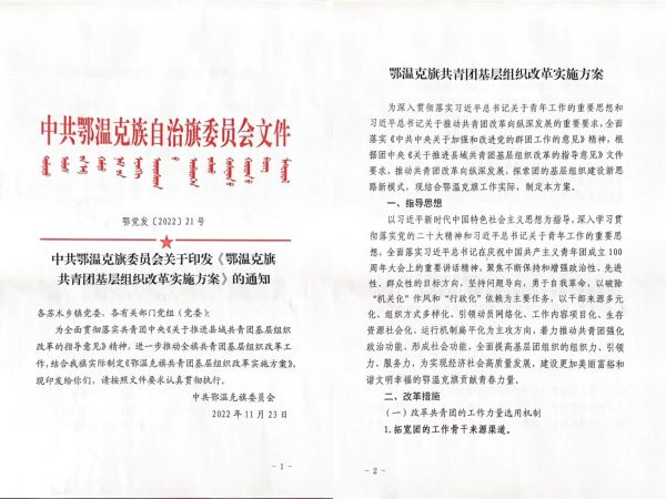 《中共鄂温克族自治旗委员会关于印发<鄂温克族自治旗共青团基层组织改革实施方案>的通知》(鄂党发〔2022〕21号)