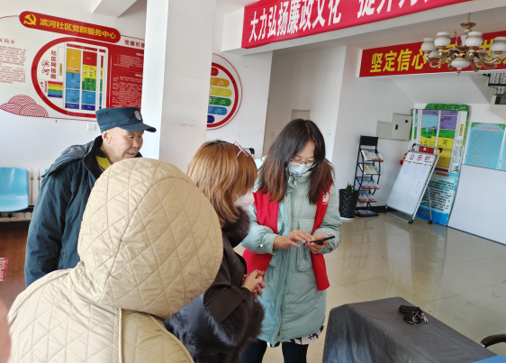 在滨河社区新时代文明实践站大厅,志愿者耐心接待前来咨询的群众,细心解答缴费标准、缴费形式、参保所需材料等问题,告知其微信缴纳医保流程,现场“手把手”地教他们在手机上进行线上缴费。
