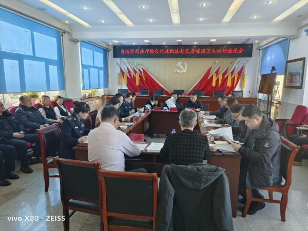 巴彦嵯岗苏木党委书记敖云达喜就苏木综合行政执法工作开展情况向调研组一行进行了汇报发言。调研组就行政执法开展情况、存在困难进行现场询问调研。