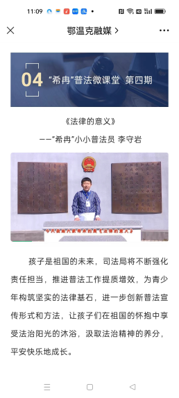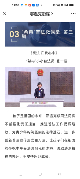 旗司法局依托AI鄂温克融媒平台,推送两期“希冉普法微课堂”,组织全旗中小学生观看《法律的意义》《宪法在我心中》普法宣传视频。学生们通过观看视频进一步了解学习法律知识的重要意义,从而提高法治意识。