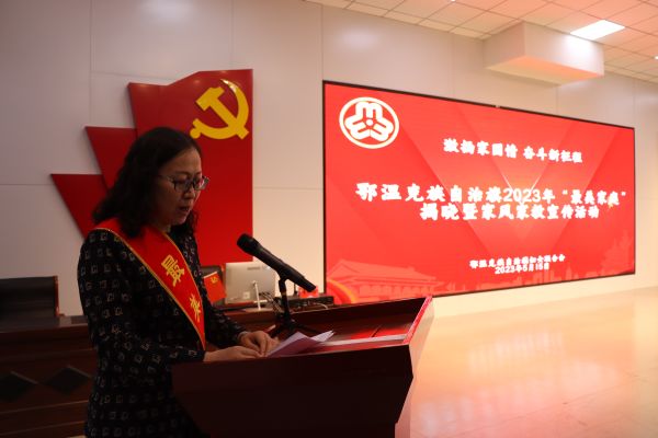 活动邀请国家二级心理咨询师、沙盘游戏心理分析师、鄂温克族自治旗教育事业发展中心心理健康教研员李仁艳老师作了题为《将成长进行到底》的主题讲座,揭晓了15户鄂温克族自治旗“最美家庭”、5户呼伦贝尔市“最美家庭”和1户自治区“最美家庭”。