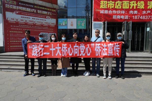 为进一步推动侨法知识学习宣传,增强归侨侨眷法律意识,保障归侨侨眷合法权益,5月17日上午,鄂温克族自治旗委统战部联合旗侨联在巴彦托海镇民贸商厦门前开展以“践行二十大 侨心向党心”为主题的侨法宣传活动。旗委统战部侨务办公室、旗侨联全体干部职工参加活动。