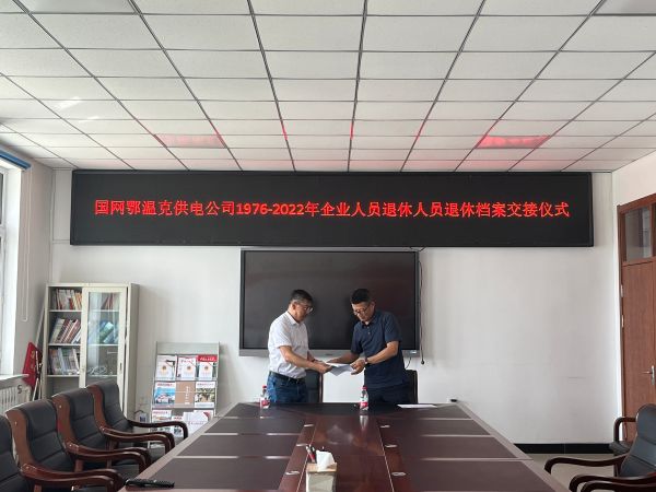 8月1日上午,鄂温克族自治旗档案史志馆与国网鄂温克族自治旗供电分公司圆满举行1976-2022年企业退休人员人事档案交接仪式。在移交现场,国网鄂温克族自治旗供电分公司正式将该企业180份退休人员人事档案移交至旗档案史志馆实行集中统一管理,进一步推动了国有企业退休人员人事档案社会化管理工作。