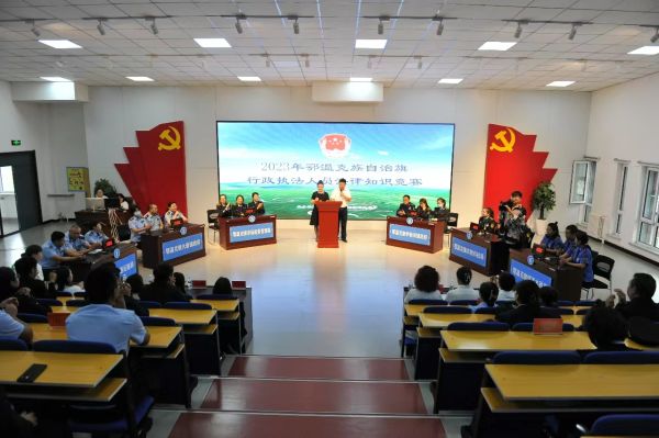 为进一步增强全旗行政执法人员法治素养,提升执法人员业务素质和执法办案服务水平,促进严格规范公正文明执法,严格落实行政执法人员能力素质提升年和行政执法监督提升年相关要求,为全面争创全区法治政府建设示范旗奠定良好的法治环境,8月23日,鄂温克族自治旗司法局举办全旗行政执法人员法律知识竞赛,呼伦贝尔市司法局行政执法协调监督科副科长赵雨濛、旗委政法委副书记黄心蕊出席本次知识竞赛,全旗各行政执法单位的100余人现场观赛。