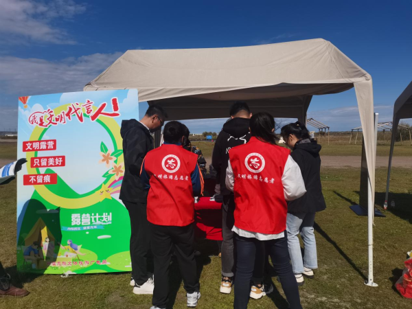 活动现场,由鄂温克族自治旗文体旅游广电局组成的志愿者团队走进露营地,通过宣传讲解文明旅游知识,发放文明旅游宣传手册、《呼伦贝尔市旅游地图》等宣传材料,开展文明劝导,组织市民游客积极参与等形式,号召广大市民游客以实际行动践行文明旅游新风尚。志愿者们积极向游客讲解文明露营注意事项,“做文明旅游先行者”“绿色露营”“与文明同行”游客们在宣传横幅上写下自己对文明露营的倡议。同时,活动设计了“我是文明代言人”“文明露营”“只留美好不留痕”等文明旅游主题打卡牌,吸引了不少市民游客驻足,主动拿起标语打卡拍照。