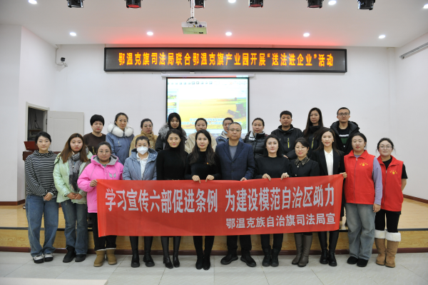 为深入贯彻落实习近平总书记对内蒙古重要指示批示精神,做好对《内蒙古自治区全方位建设模范自治区促进条例》等六部促进条例的学习宣传,进一步增强市场主体的法治获得感,全力构筑惠企暖企营商环境,持续营造亲商护商优良氛围,近日,鄂温克族自治旗司法局联合旗产业园开展送法进企业活动。旗司法局党组书记、局长敖丽娜同志出席活动并讲话。旗产业园区30名企业代表参加活动。