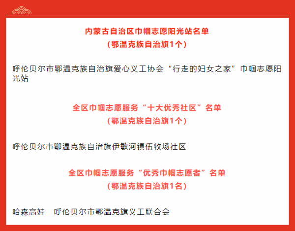 近日,鄂温克族自治旗1个组织被评为“内蒙古自治区巾帼志愿阳光站”,1个社区被评为全区巾帼志愿服务“十大优秀社区”,1人被评为全区巾帼志愿服务“优秀巾帼志愿者。