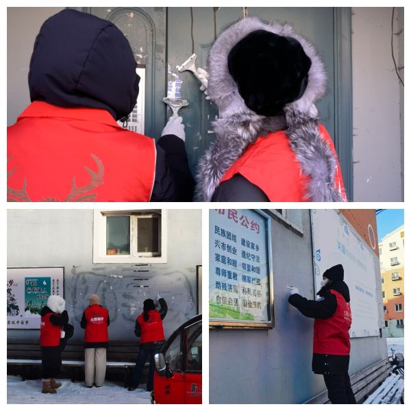 呼伦贝尔正值寒冬,活动当日,党员志愿服务队手持清洁工具,热情高涨地投入到小区环境整治中。大家对小区楼道进行了集中清理,捡拾烟头纸屑、清除杂物,同时,针对公共区域墙面、公共设施上张贴的“小广告”进行了仔细铲除,努力还原小区整洁面貌。在劳动过程中,志愿者们还积极向小区居民宣传文明城市创建的意义和环境卫生的重要性,引导居民养成良好的卫生习惯,共同维护整洁优美的居住环境,营造“人人参与创城、共建美好家园”的浓厚氛围。