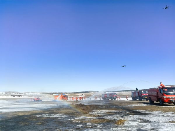 演练模拟林区突发火情的真实场景,共出动人员56名,调集消防水车4辆、运兵车8辆、无人机2台及各类防灭火装备若干套。