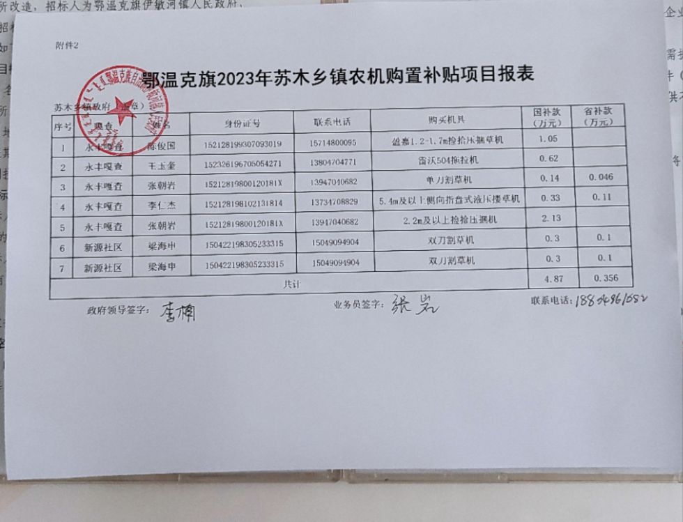 2023年鄂温克族自治旗苏木乡镇农机购置补贴项目报表