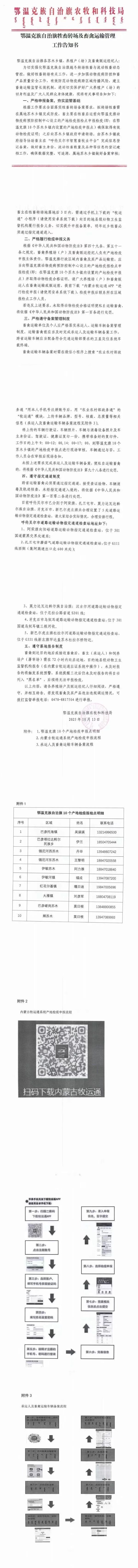 鄂温克族自治旗牲畜转场及畜禽运输管理工作告知书