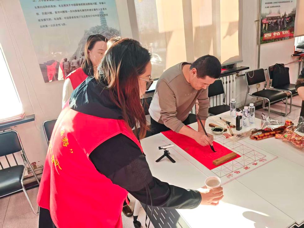 活动现场年味浓郁,红彤彤的春联纸整齐铺展,笔墨砚台依次排开。十余位书法老师各展所长,笔走龙蛇间,行书的流畅、楷书的端庄、隶书的古朴跃然纸上。“春回矿区千山秀,福泽各族万户欢”“挥汗检修保生产,凝心聚力庆华章”等寓意吉祥的春联,既饱含对新年的美好期许,又融入企业发展与民族团结的真挚祝愿。各族干部职工群众有序排队,或挑选经典联句,或提出个性化创作需求,老师们有求必应,现场挥毫创作近百余副春联与“福”字,墨香与欢声笑语交织,勾勒出浓郁的节日图景。