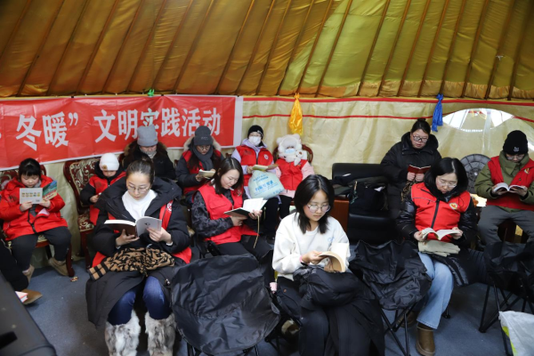 “围炉阅读”环节成为传递知识与民族团结的温馨空间。在蒙古包内,炉火熊熊燃烧,驱散了冬日的严寒,也让志愿者们的心紧紧贴在一起。大家纷纷拿出自带的图书,既有经典名著、现代文学佳作,也有民间故事集、传统习俗绘本等经典书籍。围坐炉边,志愿者们或静心品读,或轻声分享阅读感悟。孩子们捧着色彩斑斓的绘本,用稚嫩的声音轮流朗读,小朋友们相互请教、彼此交流,在书香中播下友谊的种子。书香与炉火的暖意交织,民族文化与思想智慧碰撞,构成一幅各民族干部群众共学共进、相亲相爱的温馨画卷。