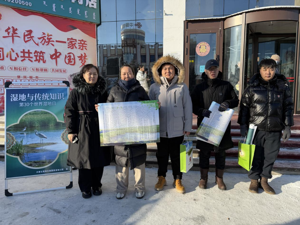 为迎接第30个“世界湿地日”,深入贯彻《中华人民共和国湿地保护法》,切实提升公众湿地保护意识,2026年2月2日,内蒙古辉河国家级自然保护区管理局联合鄂温克族自治旗林草局、莫和尔图湿地公园,在鄂温克族自治旗巴彦托海镇共同开展以“湿地与传统知识 致敬文化遗产”为主题的宣传教育活动。 活动紧扣年度主题,聚焦湿地生态保护核心诉求,通过摆放宣传展板、张贴海报和发放《湿地保护法》传单、野生动物保护宣传册、自然保护法律法规汇编等资料,向过往群众系统普及湿地保护法律条款、野生动物生存习性及相关保护常识。
